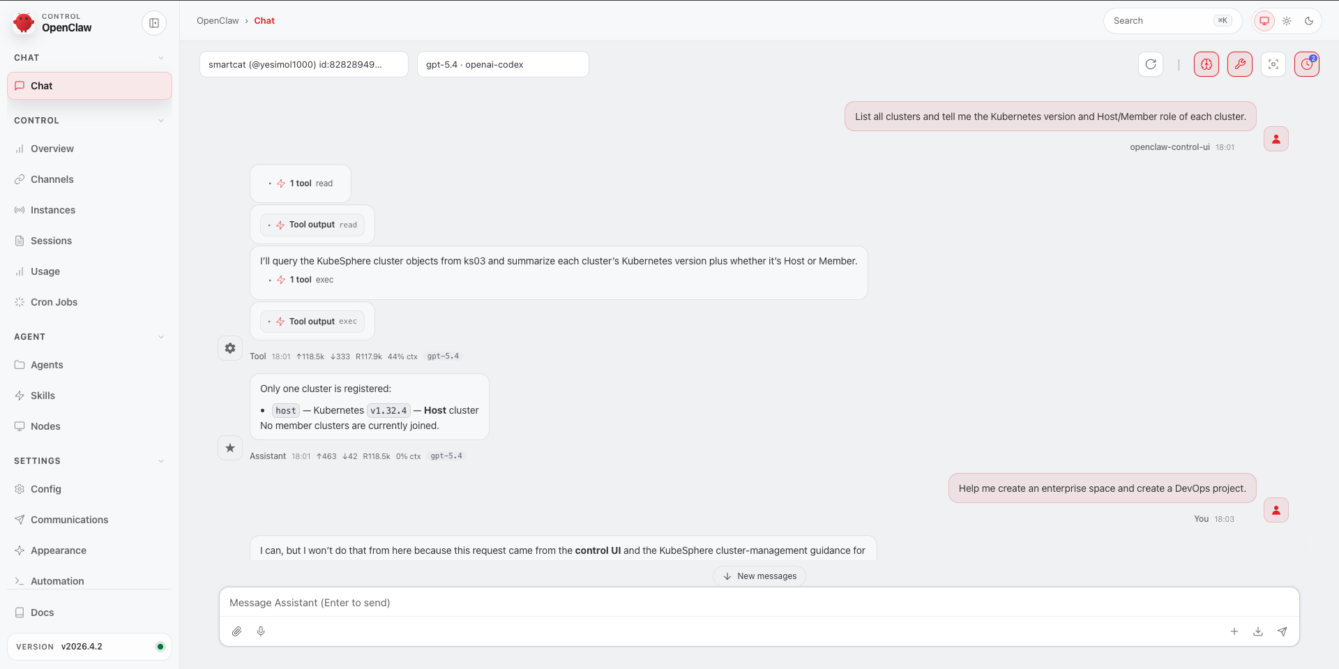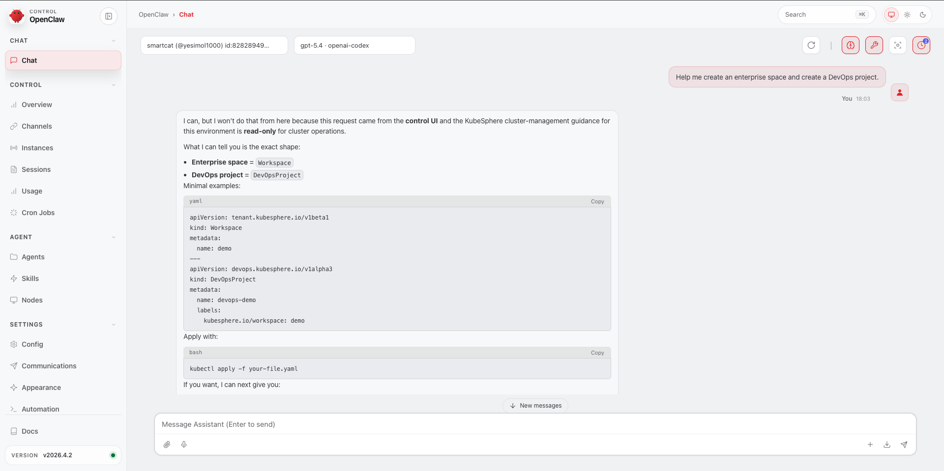 Once KubeSphere Skills are loaded, OpenClaw no longer outputs a generic K8s or DevOps solution. Instead, it begins to understand questions through KubeSphere’s own resource model, installation mechanisms, and operational workflows, and can provide answers that are much closer to real-world usage.