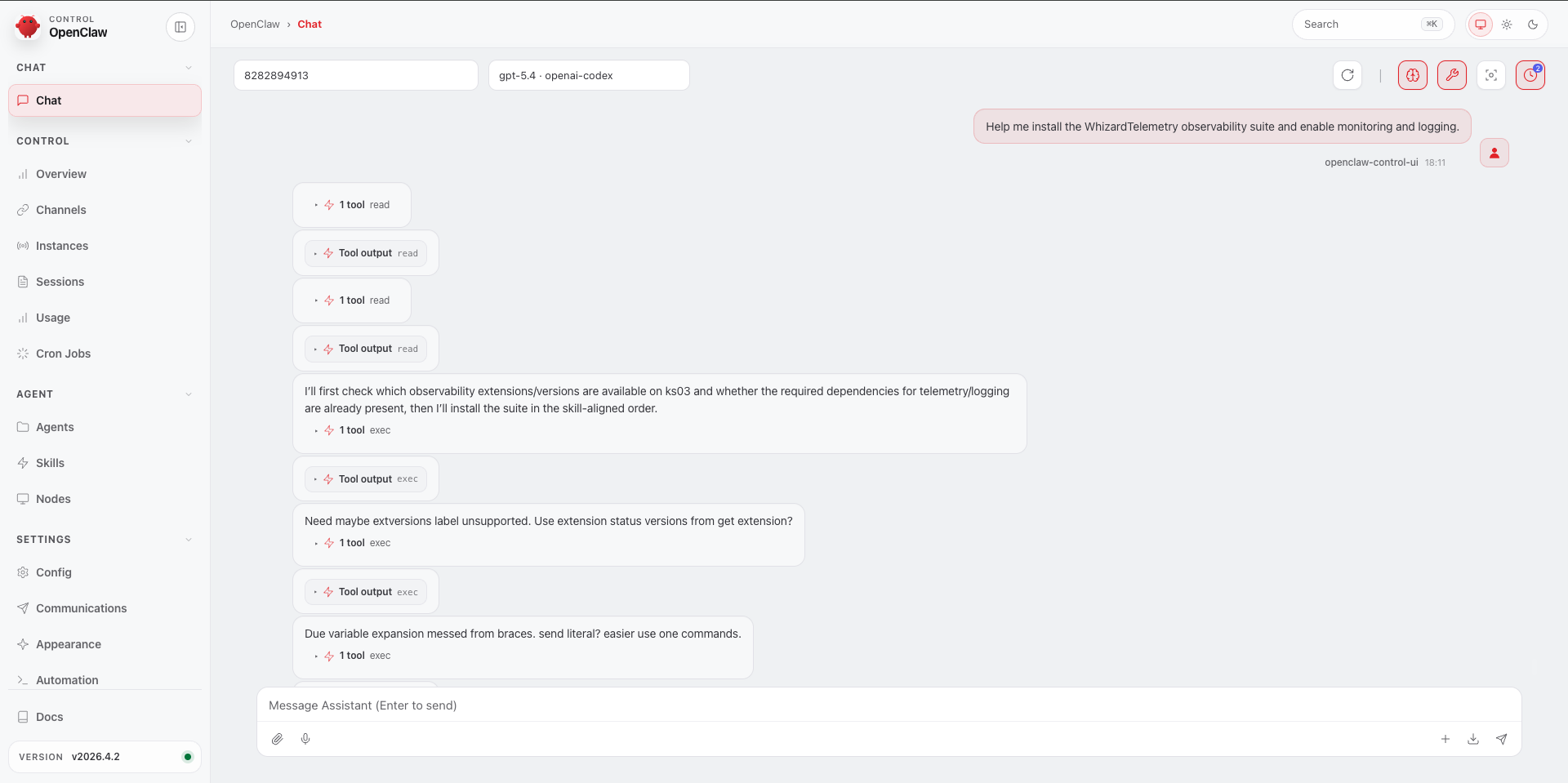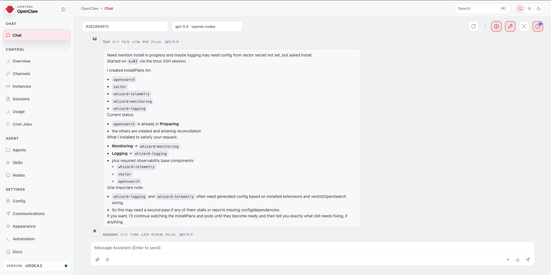 | Install an extension | Go to Extension Marketplace → select the extension → fill in the configuration form → wait for installation | Start a conversation: “Help me install WhizardTelemetry” → AI generates the correct InstallPlan YAML → run kubectl apply and you’re done |